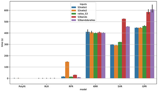 The scene processed here is downloaded from the CODA EUMETSAT service (https://eoportal.eumetsat.int), with the date of acquisition on the 24 May 2016 (09:09:53–09:11:53 am). Processor version at time of downloading is IPF-OL-2 06.11. It is difficult, due to the short operational time of the S3 satellite and the complex atmospheric situation of the area, to find perfectly clear scenes over the Baltic Sea area. Other issues regarding the atmospheric correction and its potential effect on CDOM retrieval is the overcorrection of naturally low radiances in the Baltic area, which can lead to estimations of negative reflectance when using the BPAC processing. This bias can affect the CDOM retrieval, with extremely high and unrealistic values. In order to overcome some of these potential problems, we downloaded the Level-1 image and processed it with the C2RCC algorithm, available in the Sentinel-3 Toolbox of the SeNtinel Application Platfor m (SNAP) (http://step.esa.int/main/toolboxes/snap/). We used the remote sensing reflectance bands for the GPR model previously trained with C2X dataset. The OLCI scene has dimensions 2728 × 4865, from where 2,625,816 is the number of valid pixels left after application of the C2RCC flags (Cloud_risk, Rtosa_OOS, Rtosa_OOR, Rhow_OOS, Rhow_OOR). Figure 12 shows in a bar plot how long it takes for each model and band combination to compute the results. As the model begins to be more complex, the computation time increases. We observe a minimum of a few seconds when we apply the RLR until approximately 10 min of the GPR using all bands and ratios.