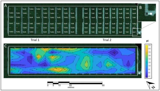 Orthophoto of the experimental field extracted from the hyperspectral imager containing the experimental setup of the two investigated field trials (A); detail of the reflectance plates used for radiometric calibration as placed in the field (B); contour map of the initial BCN population density in the topsoil (0–30 cm) (C); The map was linearly interpolated from the 108 data points representing the sampled plots using the average of its neighbors for non-sampled plots.
