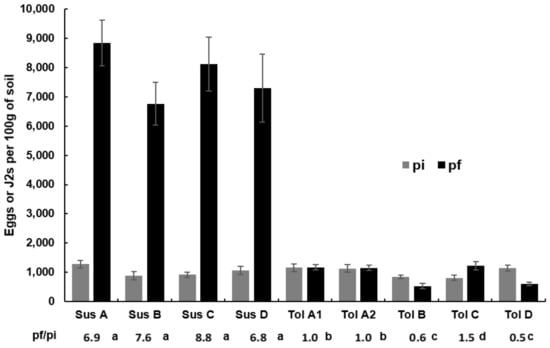 The initial BCN population density per treatment (cultivar) varied from 814 to 1283 J2s per 100 g soil on average in the topsoil (CV of 15%) (Table 3). There was no significant difference between the initial BCN infestations of the treatments, which were all affected by a high BCN pressure on average. The ratio pf/pi is an indicator for reproduction and represents the ability of the cultivar to prevent nematode reproduction in the roots [58]. The reproduction index pf/pi in the topsoil was on average 1.1 for the tolerant cultivars and 8.6 for the susceptible cultivars (Figure 2). Tolerant cultivars B and D performed the best with an average pf/pi ratio below one (0.65 and 0.55, respectively).