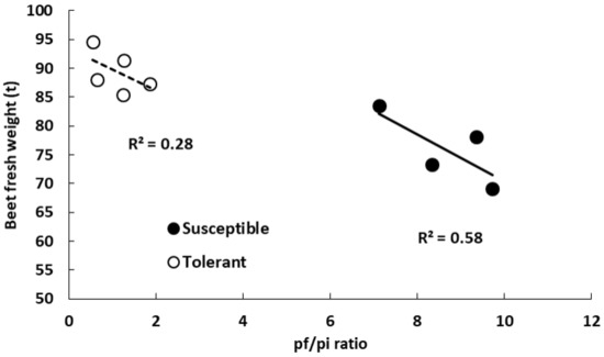 For both susceptible and tolerant cultivars, final beet fresh weight was not significantly correlated with the pf/pi ratio (Figure 3). However, there was a trend showing that the more nematodes reproduce in the roots, the higher is the yield-reducing effect. This trend was higher for the susceptible cultivars (R2 = 0.58, p = 0.24) than for the tolerant ones (R2 = 0.28, p = 0.37).