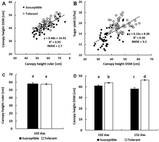 (A) Relationship between canopy height derived from the digital elevation model (CHDSM) and canopy measured by a ruler (CHruler) 102 das (n = 104, p < 0.01); (B) final sugar yield as a function of the CHDSM 152 das (n = 104, p < 0.01); (C) average CHruler of tolerant and susceptible cultivars 102 das; (D) average CHDSM of tolerant and susceptible cultivars 102 and 152 das. Error bars represent the standard error. Different lower case letters indicate significant differences between cultivar types at p < 0.05.