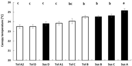 Average canopy temperatures of five tolerant and four susceptible cultivars 153 das. Error bars represent the standard error. Different lower case letters indicate significant differences between genotypes (p < 0.05).