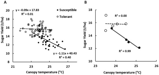 White sugar yield at harvest as a function of the canopy temperature 152 das at the (A) plot and (B) cultivar levels.