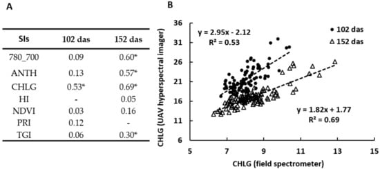 (A) Coefficient of determination R2 for the relationship between SIs computed from the field spectrometer and from the UAV hyperspectral imager. * Significant correlations (n = 96, p < 0.05); (B) relationship between CHLG index computed from field spectrometer and UAV hyperspectral imager at 102 (p < 0.01) and 152 das (p < 0.01).
