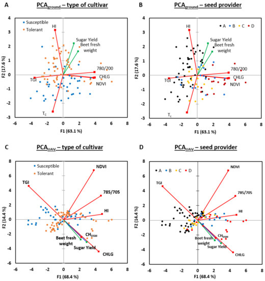 The differences observed between PCAground and PCAUAV confirms the low correlations between SIs computed from the field spectrometer and from the UAV hyperspectral imager. Variables used did not allow us to discriminate easily between the types of cultivars (Figure 8c). One reason is surely the missing thermal data at the UAV level. Another reason is that height measurements at ground level were not sufficient to reveal genotypic differences between the investigated sugar beet types, which in contrast UAV-based height measurements could show on plot level. PCAUAV confirmed the close relationship between canopy height and sugar yield at this advanced stage of the sugar beet growth. Cultivars from groups A and D could be differentiated using CHLG and TGI indices confirming the good ability of chlorophyll related indices for the characterization of genetic background.