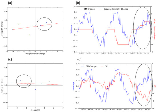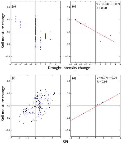 The relationship between 26-week soil moisture change and 26-week drought intensity change (plots (a,b)), and the relationship between 26-week soil moisture change and six-month SPI (plots (c,d)) over the central valley in California (37.077°N, 120.436°W).