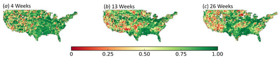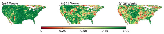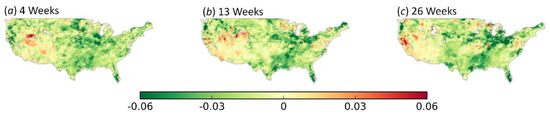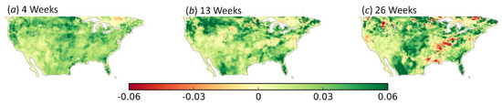 Correlation coefficient of the linear regression between the change in soil moisture and the change in drought intensity over CONUS at multiple time intervals: (a) four weeks, (b) 13 weeks, and (c) 26 weeks.