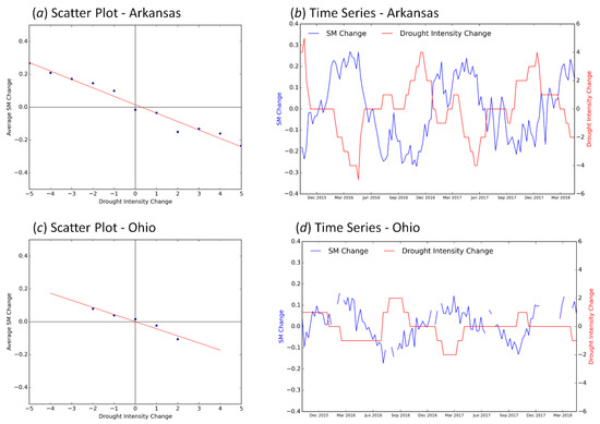 From Figure 2, it can be observed that the slope values were more negative in the eastern United States (US) when compared with the Midwest and the western US. The slope values were mostly around zero over the Midwest and the western parts of the country, and further, over small parts of western US, the values were positive. Similarly, the areas with negative slopes exhibited higher correlation (Figure 3), and lower values of correlation were observed over areas with slope values closer to zero or greater than zero. The small white patches in Figure 2 and Figure 3 are the areas where there are not enough data points to statistically determine a slope for the linear regression. Then, we examined randomly selected grids across CONUS to further analyze this pattern of slope values. The analysis revealed that the change in soil moisture was able to indicate the change in drought intensity. An example for this is presented in Figure 4, where the relationship between 26-week soil moisture change and 26-week USDM drought intensity change is presented in the form of scatter plots and a time series over a M36 grid in Arkansas (33.627°N, 94.294°W) (Figure 4a,b) and a grid in Ohio (40.687°N, 80.850°W) (Figure 4c,d). The scatter plots (Figure 4a,c) demonstrate the overall relationship between the two variables, and the time series (Figure 4b,d) clearly indicates the co-variation of the changes in soil moisture and USDM drought intensity. From the time series, it can be observed that a positive soil moisture is immediately reflected in improving drought conditions (negative change in the USDM), and vice versa. It can also be observed that the change in soil moisture and the change in drought intensity almost mirror each other, and the drought intensity change lags behind the soil moisture change by few weeks. This lag time varied for different parts of the CONUS.