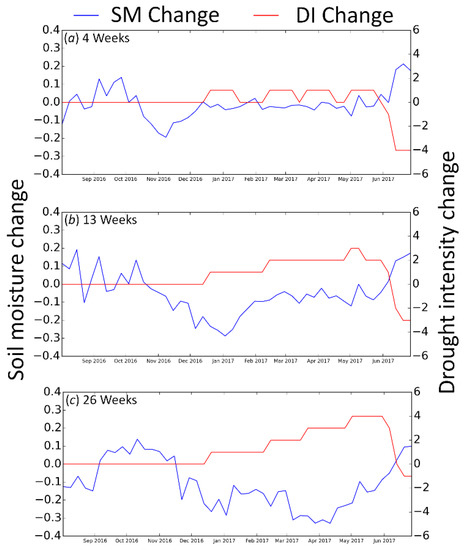 The data analysis revealed that soil moisture change was able to track the change in drought conditions over most parts of the CONUS. It was further observed that the soil moisture change at relatively longer intervals (13 weeks or 26 weeks) was able to identify the change in drought conditions, as indicated by the USDM drought intensity index. On the other hand, short-term soil moisture change (over four weeks) more closely resembled the one-month SPI. Scaini et al. [10] also observed good correlation between soil moisture anomalies from the SMOS satellite and the SPI estimated at 30 to 50-day intervals. In addition, previous studies demonstrated that short-term SPI (one to three months) had higher correlation with soil moisture measurements made at 10-cm depth [35], and long-term SPI are correlated with soil moisture at deeper layers of the strata [33]. These results suggest that soil moisture change estimated at multiple time intervals complement each other and provide information about varying drought conditions. For example, a short-term decrease (over four weeks) in soil moisture may indicate a decrease in precipitation over the time period, whereas a persistently negative soil moisture change over a relatively longer time interval (13 weeks or 26 weeks) could indicate agricultural drought. It is to be noted that the maximum time period considered for change analysis was limited to six months in this study for the sake of simplicity and clarity. However, during very long periods of persistent droughts (lasting for one year or more), change analysis done for periods less than a year may not provide much valuable information. Hence, the time period considered for change analysis can be varied between one month and 24 months, or even more for practical applications similar to the use of long-term SPI (24 months and 60 months) in the development of the USDM long-term drought impact maps [31].