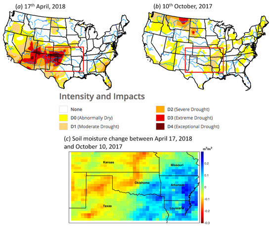 Another example of the soil moisture change indicating the change in drought conditions is presented in Figure 6. In the figure, the USDM maps published on 17 April 2018 (Figure 6a) and 10 October 2017 (Figure 6b) are shown. The time periods are selected such that they are 26 weeks apart. In Figure 6c, the soil moisture change observed over the Southern states (indicated with a red rectangle in Figure 6a,b) over the same time interval is shown. From the figures, it is strikingly clear that the areas where the drought conditions had intensified in April 2018 in comparison with October 2017 (over parts of Kansas, West Oklahoma, and West Texas) are associated with a negative soil moisture change (indicated with yellow and red shades in Figure 6c), and the areas where the drought conditions had improved (over parts of Missouri, Arkansas, and Louisiana, East Texas, and East Oklahoma) are associated with a positive soil moisture change (indicated with blue shades in Figure 6c). The areas with closer to zero change (indicated with green shade in Figure 6c) in the drought-affected regions were actually dry during 10 October 2017. Since those grids were dry in the starting time itself, they did not show any major changes in the soil moisture value during April 2018.