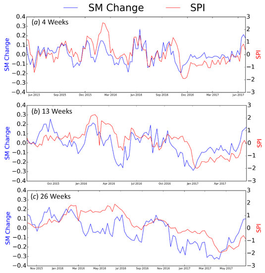 Time series of soil moisture change and SPI over a grid in Florida (27.101°N, 81.224°W). The plots (a–c) indicate the comparison of four-week, 13-week, and 26-week soil moisture change intervals with one, three, and six-monthly SPI intervals, respectively.