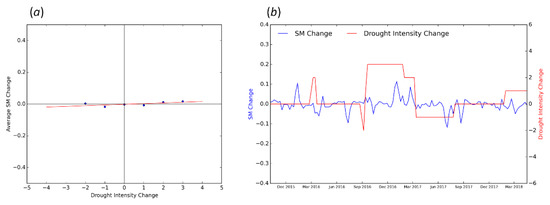 The values of the change in drought intensity were discrete, and on the other hand, the changes in the observed soil moisture had continuous values. When plotting these two variables against each other, we observed that each drought intensity change was associated with multiple values of change in soil moisture (Figure 1a). Hence, to overcome this issue, all of the soil moisture change values associated with each USDM change value were averaged (Figure 1b); then, a linear relationship was established between the USDM change and the soil moisture change. From Figure 1b, it can be observed that the positive values of soil moisture change are related to the negative values of change in UDSM drought intensity (improving drought conditions), and vice versa. This indicates that the linear relationship between soil moisture change and drought intensity change should have a negative slope. The locations of all of the grid points were used as examples in this paper to show that the relationship between soil moisture change, the USDM, and the SPI are plotted in Figure A1 in Appendix A.