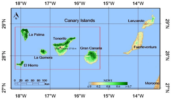 The Canary Islands Archipelago (Spain) is located off the north-west African coast (Morocco). The image is a NDVI composition from the Terra-MODIS sensor at a 500-m spatial resolution on 30 December 2015 retrieved from the online Land, Atmosphere Near Real-time Capability for the EOS (LANCE) system (https://lance-modis.eosdis.nasa.gov/imagery/subsets/?area=af). The red rectangle includes five islands studied.