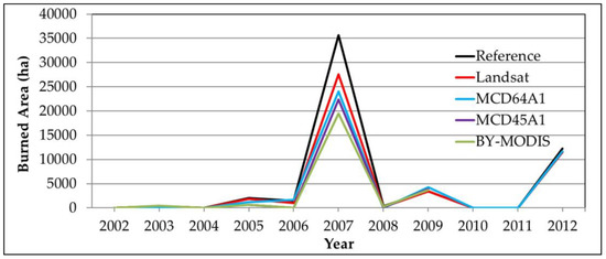 The results of the accuracy of the BA estimate obtained from the scatter plots of the various products versus the reference map using a 2.5 km × 2.5 km grid are shown in Table 7. The determination coefficient (R2) over the 2002–2012 period for the BY-MODIS, MCD45A1, and MCD64A1 products was 0.82, 0.81, and 0.88, with a slope of 0.76, 0.81, and 0.93, respectively.