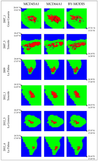 Detection of fires greater than 2000 ha in the Canary Islands’ forestry region for MCD45A1, MCD64A1, and BY-MODIS.