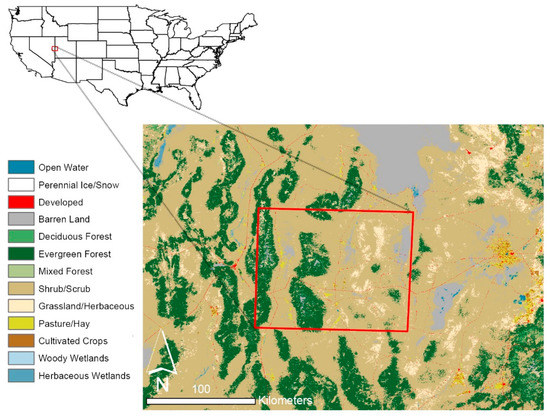 Our analysis considers a single Harmonized Landsat-8 Sentinel-2 (HLS) tile (11SQD; https://hls.gsfc.nasa.gov/) located in Utah and Nevada, USA representing approximately 12,000 km2 or 14M pixels (30-m spatial resolution) (Figure 1). The study area is dominated by shrub/scrubs (68%), followed by evergreen forests (19%), bare ground (5%), grassland/herbaceous (5%), and pasture/hay (1%) land cover according to the 2011 National Land Cover Database (NLCD; [21]). PRISM climate normals (1981–2010) indicate that the average temperature and total precipitation range from −2 to 11 °C and from 160 to 810 mm, respectively, largely reflecting local elevation differences (1339–3781 m). Cheatgrass is relatively common in the lowlands of the study area [22].