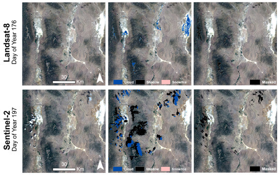 (Left) Harmonized Landsat-8 Sentinel-2 (HLS) imagery (RGB; Bands 4, 3, and 2) overlaid by mask layers created using LaSRC (Top Middle [28]), FMask (Bottom Middle [27]); and (Right) decision tree models.