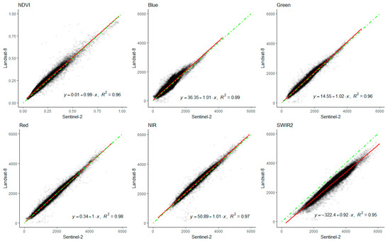 We compared the radiometric characteristics of HLS bands using one-day-apart images acquired over the study area, to ensure HLS band-pass adjustments were of sufficient quality for our analysis. Small time differences reduce uncertainties related to radiometric bias caused by external factors. The selected MSI and OLI image pairs (Table 1) were generally unaffected by clouds and were further screened using masks developed for this study. We sampled approximately 50,000 different pixels across the site and compared surface reflectance data from equivalent bands (i.e., blue, green, red, near-infrared (NIR), and short-wave infrared (SWIR) 2) and the normalized difference vegetation index (NDVI) calculated using Equation (1) and bands B8A and B04 for MSI imagery as suggested by others [30].