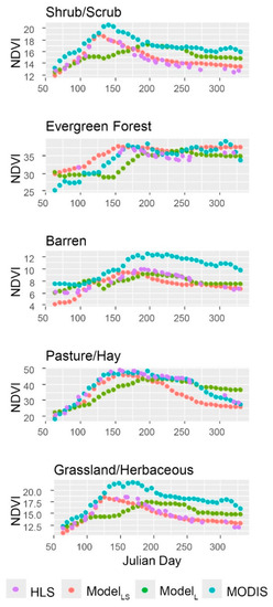Time series of Harmonized Landsat-8 Sentinel-2 (HLS), predicted, and eMODIS Normalized Difference Vegetation Index (NDVI × 100) separated by major land cover classes [21]. ModelLS was generated using both Landsat-8 and Sentinel-2A inputs, while ModelL was generated using only Landsat-8 inputs. Each time series is calculated from all pixels (excluding masked pixels in the original HLS time series) representing largely homogenous areas (coefficient of variation < 40%) and smoothed using a three-week sliding window approach. Timesteps where HLS data coverage was less than 70% are not shown.