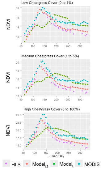 Time series of Harmonized Landsat-8 Sentinel-2 (HLS), predicted, and eMODIS Normalized Difference Vegetation Index (NDVI × 100) separated by percentage cheatgrass cover [22]. ModelLS was generated using both Landsat-8 and Sentinel-2A inputs, while ModelL was generated using only Landsat-8 inputs. Each time series was from all pixels (excluding masked areas in the original HLS time series) and smoothed using a three-week sliding window approach. Timesteps where HLS data coverage was less than 70% are not shown.