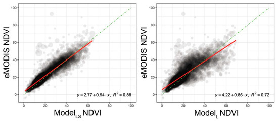 eMODIS versus predicted (upscaled to 250-m spatial resolution using bilinear interpolation) growing season (April–September) Normalized Difference Vegetation Index (NDVI × 100) for randomly selected pixels (n ~ 10,000). ModelLS was generated using both harmonized Landsat-8 and Sentinel-2A inputs, while ModelL was generated using only harmonized Landsat-8 inputs. Darker regions represent larger numbers of sampled pixels. Dashed-green line is 1-to-1 and the red line is the ordinary-least squares regression fit weighted by the inverse of the coefficient of variation (CV) determined from a focal scan of the eMODIS Growing Season NDVI product (e.g., more weight to homogenous areas [larger points]).