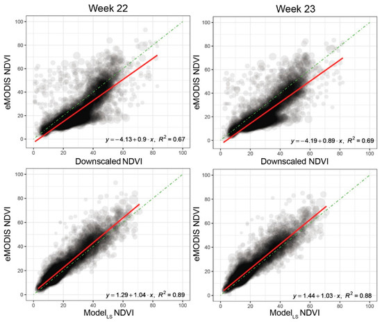 eMODIS versus predicted (upscaled to 250-m spatial resolution using bilinear interpolation) normalized difference vegetation index (NDVI × 100) for randomly selected pixels (n ~ 10,000) during Weeks 22 and 23. ModelLS was generated using both harmonized Landsat-8 and Sentinel-2A inputs, while downscaled NDVI was generated using regression tree models with harmonized Landsat-8 and eMODIS inputs. Darker regions represent larger numbers of sampled points. Dashed-green line is 1-to-1 and the red line is the ordinary-least squares regression fit weighted by the inverse of the coefficient of variation (CV) determined from a focal scan of the eMODIS growing season NDVI product (e.g., more weight to homogenous areas [larger points]).
