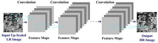 CNN has been successfully applied to spatial enhancement of single images [29,30,31,32,33]. In [29], Dong et al. proposed a super-resolution CNN network (SRCNN). As shown in Figure 1, the CNN architecture for super-resolution is composed of several convolutional layers. The input of the network is the LR image, which is first up-scaled to the same size of its HR version. Activity of the i-th feature map in the l-th convolutional layer can be expressed as [36]