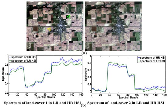 (a) Color composite (bands 29, 16, 8) of HR HSI (left) and LR HSI (right), the image is cropped from AVIRIS Indian pines data; (b) Spectra of two different land-covers in HR HSI and LR HSI, the two land-covers are marked in (a).