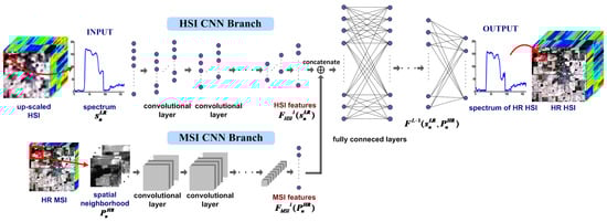 According to the framework in Figure 3, we design a CNN model with a two-branch architecture for HSI-MSI fusion, as shown in Figure 4. The two CNN branches are devoted to extracting the features from the LR HSI and the HR MSI. The LR HSI is firstly up-scaled to the same size with the HR MSI, features are extracted by the two branches from the spectrum of each pixel in the up-scaled HSI, and its corresponding spatial neighborhood in the HR MSI. The HSI branch takes spectrum of the n-th pixel in the up-scaled HSI as input, after l layers of convolutional operation in Equation (1), we could extract features from the LR HSI. It should be noted that the input is a 1-D signal. Therefore, all of the convolutional operations in this branch reduce to 1-D computation, so all of the convolutional kernels and feature maps per convolutional layer in this branch reduce to 1-D case.