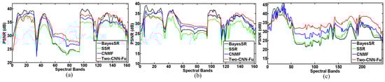 PSNR values of each band of different fusion results by a factor of two, (a) on AVIRIS Indian pines data; (b) on AVIRIS Moffett Field data; (c) on EnMAP Berlin data.