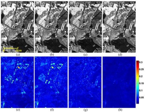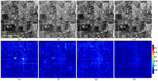 Reconstructed image (band 200) and root mean square error (RMSE) maps of different fusion results by a factor of two. The testing image is cropped from Berlin of EnMAP data with size 256 × 160. (a) result of SSR [12]; (b) result of BayesSR [13]; (c) result of CNMF [6]; (d) result of Two-CNN-Fu; (e) RMSE map of SSR [12]; (f) RMSE map of BayesSR [13]; (g) RMSE map of CNMF [6]; (h) RMSE map of Two-CNN-Fu.