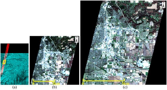 The experiment data taken over Lafayette, (a) illustration of Hyperion and Sentinel-2A data, the red part is Hyperion data, the green part is Sentinel-2A data, the white part is the overlapped region, the yellow line indicates the study area; (b) color composite (bands 31, 21, 14) of Hyperion data in the study area with size 341 × 365; (c) color composite (bands 4, 3, 2) of Sentinel-2A data in the study area with size 1023 × 1095.