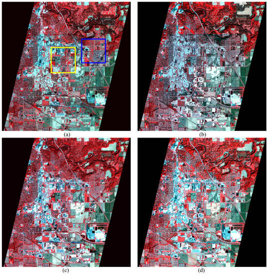 False color composite (bands 45, 21, 14) of different Hyperion-Sentinel fusion results, size of the enhanced image is 1023 × 1095 with 10 m resolution, (a) result of SSR [12]; (b) result of BayesSR [13]; (c) result of CNMF [6]; (d) result of Two-CNN-Fu.