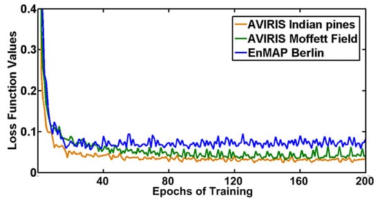 Although there is considerable difference in the spectral configurations of AVIRIS and EnMAP data, the network trained on AVIRIS data can be generalized to EnMAP data after fine-tuning. This can be explained by the hierarchy of deep learning. The bottom layers capture low-level features, such as edges and corners. These features are generic, and could be transferred to different data or sensors. The top layers extract features that are specific to the data, which need to be fine-tuned [56,57]. Therefore, when we apply Two-CNN-Fu to new data. Instead of training a whole network from scratch, we could transfer a pre-trained network to the new data and fine-tune the FC layers with only a few epochs. Satisfactory performance is expected to be achieved in this way.