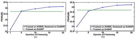 In the previous sections, we trained the Two-CNN-Fu network and tested the performance on data collected by the same sensor. In this section, we investigate the robustness of the Two-CNN-Fu network over the training data. We train the network on AVIRIS data and test the performance on EnMAP Berlin data by transferring the pre-trained network to EnMAP Berlin data. Since the two sensors have different numbers of spectral bands, the weight matrices of the first and the last FC layers need to be fine-tuned on EnMAP data. Other layers of the pre-trained network could be transferred and utilized directly. The evolution of the fusion performance over the epochs of fine-tuning is given in Figure 16. It is clear that the fusion performance can approximate or even surpass the original network trained on EnMAP data after only a few epochs of fine-tuning.