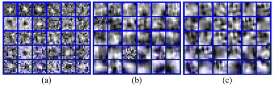 To better understand the features extracted by the network, parts of the learned kernels and the extracted features are visualized in this sub-section. In Figure 17, we show parts of the convolutional kernels in the MSI branch trained on EnMAP Berlin data. It can be observed that the convolutional kernels in different layers reveal different patterns. For example, in Figure 17a, the first kernel in the first row looks like Gaussian filter, whereas the first two kernels in the second row are like Laplacian filters, which would extract high-frequency information, such as edges and textures. In Figure 17b,c, the kernels in the second and third convolutional layers also reveal some patterns, but these kernels are more abstract than those of the first layer.