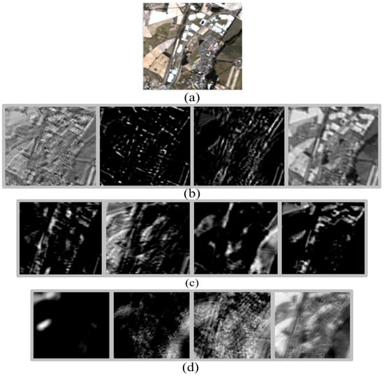 The extracted feature maps of different convolutional layers in MSI branch, the features are extracted from simulated MSI with size 128 × 128, the data is simulated from EnMAP Berlin data, (a) input MSI data; (b) feature maps of the first layer; (c) feature maps of the second layer; (d) feature maps of the third layer.