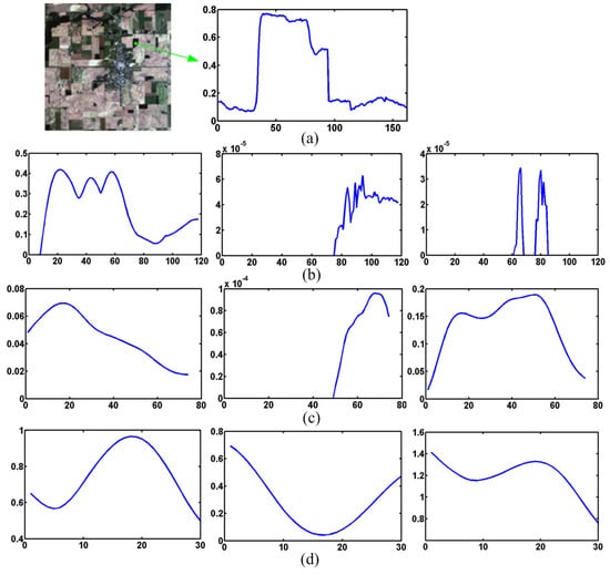 We also give parts of the features extracted by different convolutional layers in the HSI branch in Figure 19. The features are extracted from the spectrum located at (76,185) of the AVIRIS Indian pines data. As shown in Figure 19a, the features extracted by the first convolutional layer in the HSI branch are concerned with the shape and the high-frequency components. Similar to the MSI branch, the features in the higher layers are more abstract than those of the first layer. Different layers extract features from different perspectives; all these features would make contributions to the HSI and MSI fusion task.