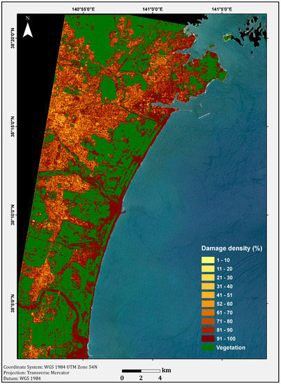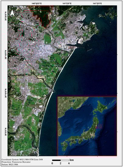 On 11 March 2011, the magnitude 9 Tohoku earthquake occurred. With its epicenter located off Japan’s eastern coast (38.322°N/142.369°E; Figure 1), the earthquake also triggered a destructive tsunami with a wave height that exceeded 10 m. Penetrating as far as 5 km inland when it struck the Japanese coast [24], the tsunami wave caused loss of human life and destruction of infrastructure. The extensive damage, assessed and reported by [25], included nearly 360,000 totally or partially destroyed houses. Although the seismic motion along the coast and inland accounted for some of the damage to housing, the tsunami was much more destructive, as it washed away many of the houses along the coast, and, in some places, it completely wiped out entire areas [25].