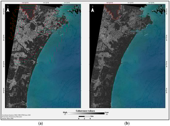 In regions that have experienced major natural disasters, data collected during the period prior to the event contributes valuable information toward understanding the pre-event nature of the land cover. The inland regions of interest that display low coherence are suspected to have exceptionally high vegetation cover, the presence of which markedly influences the results, causing an apparent loss of coherence [27,28,29]. Observations of the X-band are the most strongly affected [30], as that wavelength penetrates the upper part of the vegetation cover, such as the canopy and branches [30], and causes volumetric scattering. Furthermore, even slight, wind-generated movement of vegetation causes a loss of coherence, as shown previously by [27].
