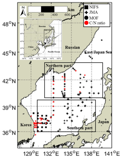 Field measurement stations in the East/Japan Sea (EJS). Squared dots indicate the NIFS (National Institute of Fisheries Sciences, Korea) stations. Cross marks are the JMA (Japan Meteorological Agency, Japan) stations. Dots are the MOF (Ministry of Oceans and Fisheries, Korea) stations. Red dots are the locations of C/N ratio measured previously.