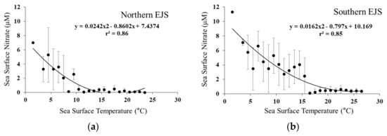 The field-measured SSN data were collected for a regional SSN algorithm in the EJS. Before modification, a relationship between SST from satellite and field-measured SSN concentrations in the northern and southern parts of the EJS was obtained (Figure 2). SSN has a significant relationship with SST in the northern part (r2 = 0.86, y = 0.0242x2 − 0.8602x + 7.4374) and the southern part (r2 = 0.85, y = 0.0162x2 − 0.797x + 10.169) of the EJS (Figure 2). The SSN is almost depleted over 10 °C and 15 °C in the northern and the southern parts of the EJS, respectively.