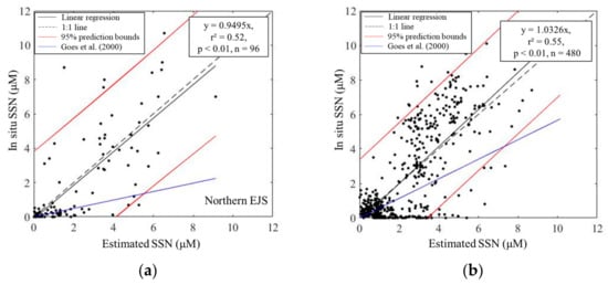 Correlations between field-measured Sea Surface Nitrate (SSN) and estimated SSN in the northern (a) and southern (b) East/Japan Sea. Dashed lines represent 1:1 lines. Red lines represent the 95% prediction bounds. Blue lines show the regression curves between in situ SSN and estimated SSN from the algorithm developed by Goes et al. (2000).