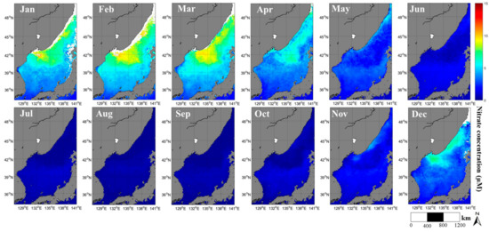 The monthly climatological images of SSN in the entire EJS are shown in Figure 4. In general, the SSN concentration in the entire EJS had a strong seasonal trend, with the highest SSN concentration during February–March the lowest concentration during June–August (Figure 4).