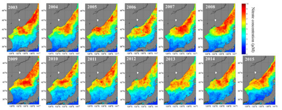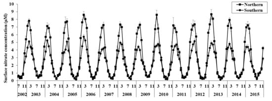 The averaged SSN concentrations from 2002 to 2015 are 3.2 µM (S.D ± 2.7 µM) and 2.3 µM (S.D ± 1.6 µM) in the northern and southern parts in the EJS, respectively (Figure 5). The average annual SSN concentrations were 6.3 µM (S.D. = ± 0.3 µM) and 3.2 µM (S.D ± 0.2 µM) in the northern and southern parts of the EJS, respectively (Figure 6). The SSN concentrations were relatively higher in the northern part compared to those in the other parts of our study area (Figure 4). Generally, the SSN concentration has negative relationships with SST and biomass of phytoplankton [38,39]. The relatively high SSN concentrations in the northern part of the EJS are probably associated with the cold water input from the deep water [34] and hence relatively lower primary productivity of phytoplankton [6,13,46,47]. In particular, the surface nutrient concentration is higher in the western Japan Basin than the Ulleung Basin and the eastern Japan Basin, which is probably related to a deeper vertical mixing in the western Japan Basin during winter [34]. The nutrient input into surface layer would be declined by a strong stratification, which makes a weak vertical mixing under ongoing climate change [28]. Recently, Jo et al. [7] reported that the increasing SST in the east coast of Korea is much faster than the global average. Indeed, decreasing field-measured nitrate concentration was observed in the southwestern EJS (i.e., Ulleung Basin) over the recent decade from 2003 to 2012 [6], though we did not observe the decreasing trend in SSN concentration in the entire EJS. A long-term monitoring study is needed to detect any changes in the nitrate concentration in the EJS under ongoing climate change.