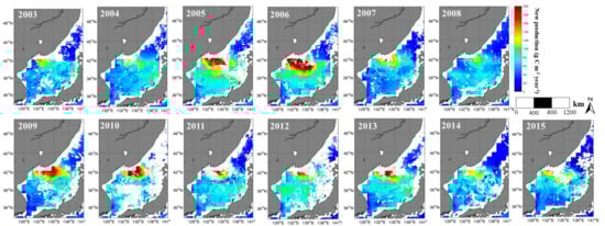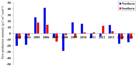 The anomalies of the annual new production in the EJS were estimated for the long-term variation study (Figure 8). Generally, the northern and southern parts of the EJS have the same phase of annual new production anomaly but sometimes they have different phases. The negative phase of annual new production anomaly appears in 2003, 2004, 2007, 2008, 2014, and 2015 in the entire EJS. The positive phase of annual new production anomaly appears in 2005, 2006, 2010, and 2013 in the entire EJS. In 2009, 2011, and 2012, the annual new production anomalies show different phases in the northern and the southern EJS. During the study period, no specific trend in annual new production anomaly was observed in the northern and southern EJS.