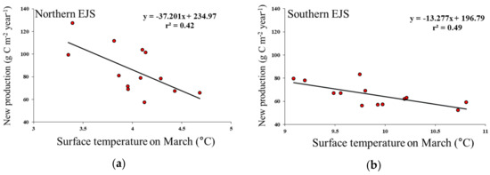 Relationships between the annual new production and Sea Surface Temperature (SST) in March in the northern (a) and southern (b) East/Japan Sea (EJS).