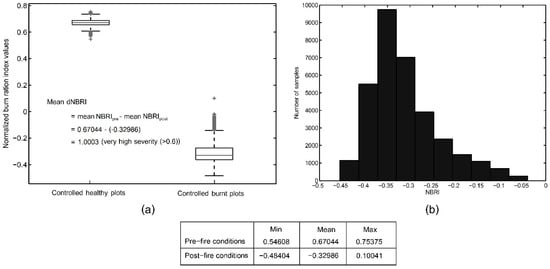 (a) The box plots of the burnt and unburnt NBRI of the training samples and the calculation of the mean dNBRI; (b) The histogram of NBRI distribution in the training burnt samples.