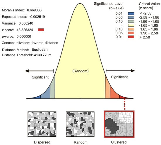 The spatial autocorrelation report from the Moran’s I technique of the ArcMap 10.2.2 software. The figure indicates that there is a high spatial autocorrelation in this study.