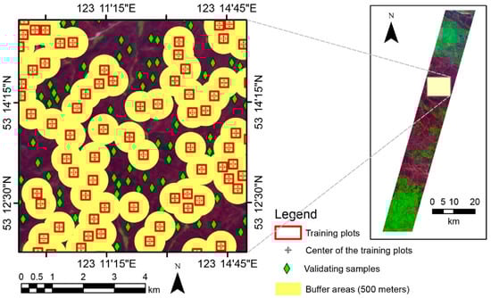 The location of training plots, training centers, and validating samples. Note that the illustration is a part of the study area.
